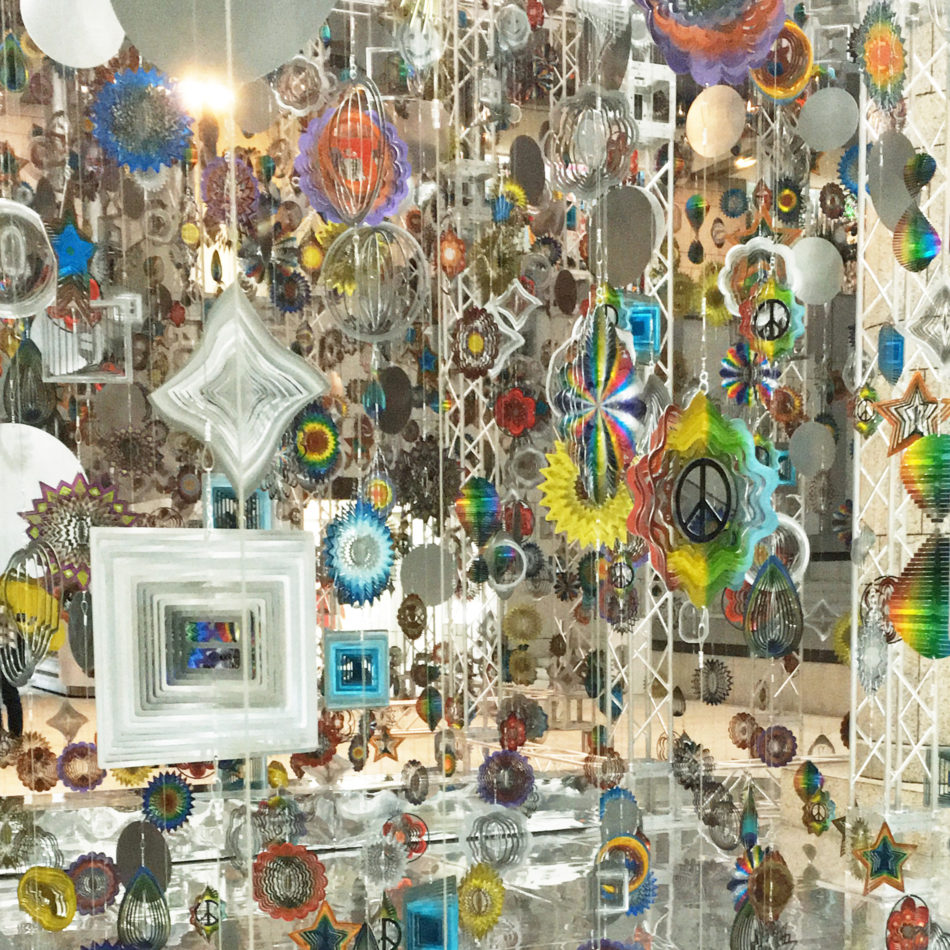 新型コロナ感染対策ということで事前に予約が必要で、予約時間である10時の10分ほど前に到着。開場の10時には長い列ができていた。入ってすぐの吹き抜けには出迎えるようにニック・ケイブの作品《回転する森》。華やかに見えながら、ピースマークや拳銃のモチーフなど、目下のアメリカのBLMを象徴するかのようなアイコンがちりばめられている。