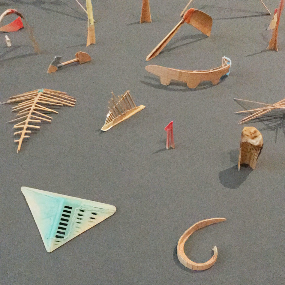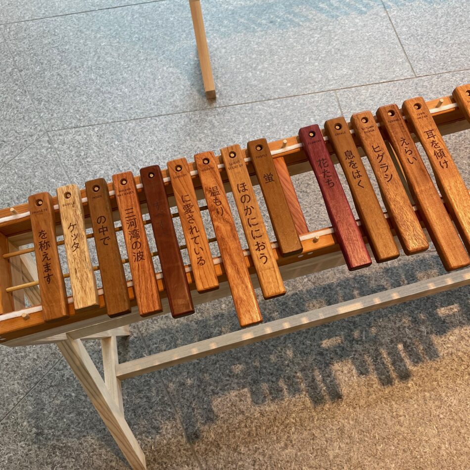 ペルー出身で現在はメキシコに拠点を置くリタ・ポンセ・デ・レオン 。複数の作品を出展していたが、異なる素材のマリンバに語句を刻み、それを鑑賞者に自由に組み替えさせ、語句の並びとそれを演奏した音を楽しむことができる《魂は夢を見ている》。アイデアは単純ながら、楽しめる作品だった。マリンバは長さが長くなると音が低くなるが、異なる種類の木材を使うことによって、見た目とは違うピッチの音が鳴るというのも面白かった。