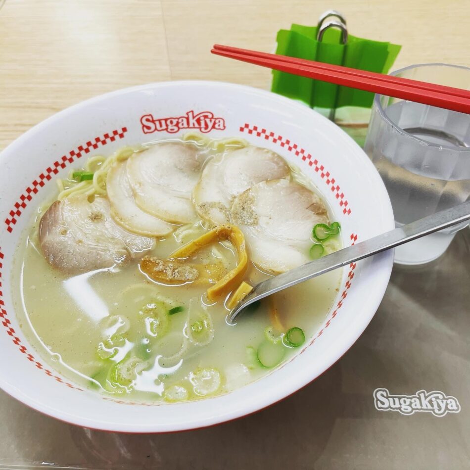 スガキヤの肉入ラーメン。大盛りにすれば良かった。コロナ対策のアクリル板を留めた養生テープと青ネギの色が響き合っていた…