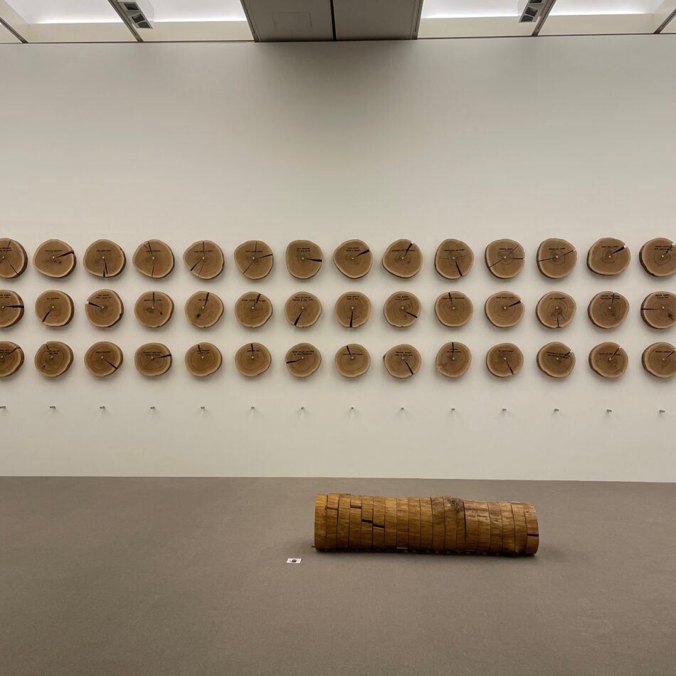 スロバキア出身ローマン・オンダック の《イベント・ホライズン》(2016)。オークの幹を切り出し、そこに1917年から2016年に起きた世界史的な事件とその年を年輪に対応させ記している。手前に置かれた切り株は数日ごとに壁に追加され、最終日には全ての切り株が展示されるのだろう。樹を使った作品なので一見温かみなども感じてしまうが、偶然なのか、刻まれた樹の裂け目が時計の針のように見え、現在に近い年代ほど直径が細く(=年輪の幅が狭く)なっていることに気づき、どんどんと早まっていく時間の流れとその行く末について想像させられる。