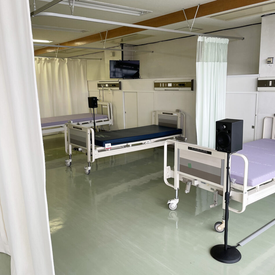 しばらく歩くと一宮の中で最も大きな展示会場である、旧一宮市立中央看護専門学校に到着。この会場で印象的だったのは、小杉大介 の《赤い森と青い雲》(2022)。会場の旧看護実習室に残る医療用ベッドの近くに配置されたモニタスピーカーからは家族同士、患者と看護婦、高齢者、子ども同士の会話や、ニュース音声などが流れる。直接的にその部屋と関係するような内容の音声ではなかったと思うが、冷ややかな看護実習室の中、誰もいないベッドの周りを歩きながら複数のスピーカーからの音が混ざり合うのを聞きながら歩くと、実際自分が病院に入院していた時や家族や友人などを病院に見舞った時の記憶、音声で語られる言葉、この旧看護実習室がかつて利用されていた時の様子の想像と、いま自分がいる旧看護実習室の空虚さ、そこを歩く自分の行為がない混ぜになって何とも不思議な心持ちになった。