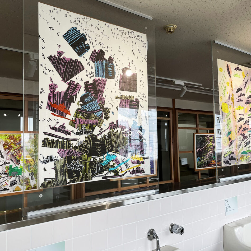 升山和明のコラージュ作品。展示されていた部屋は乳幼児の体を洗うための研修に使われた部屋らしい