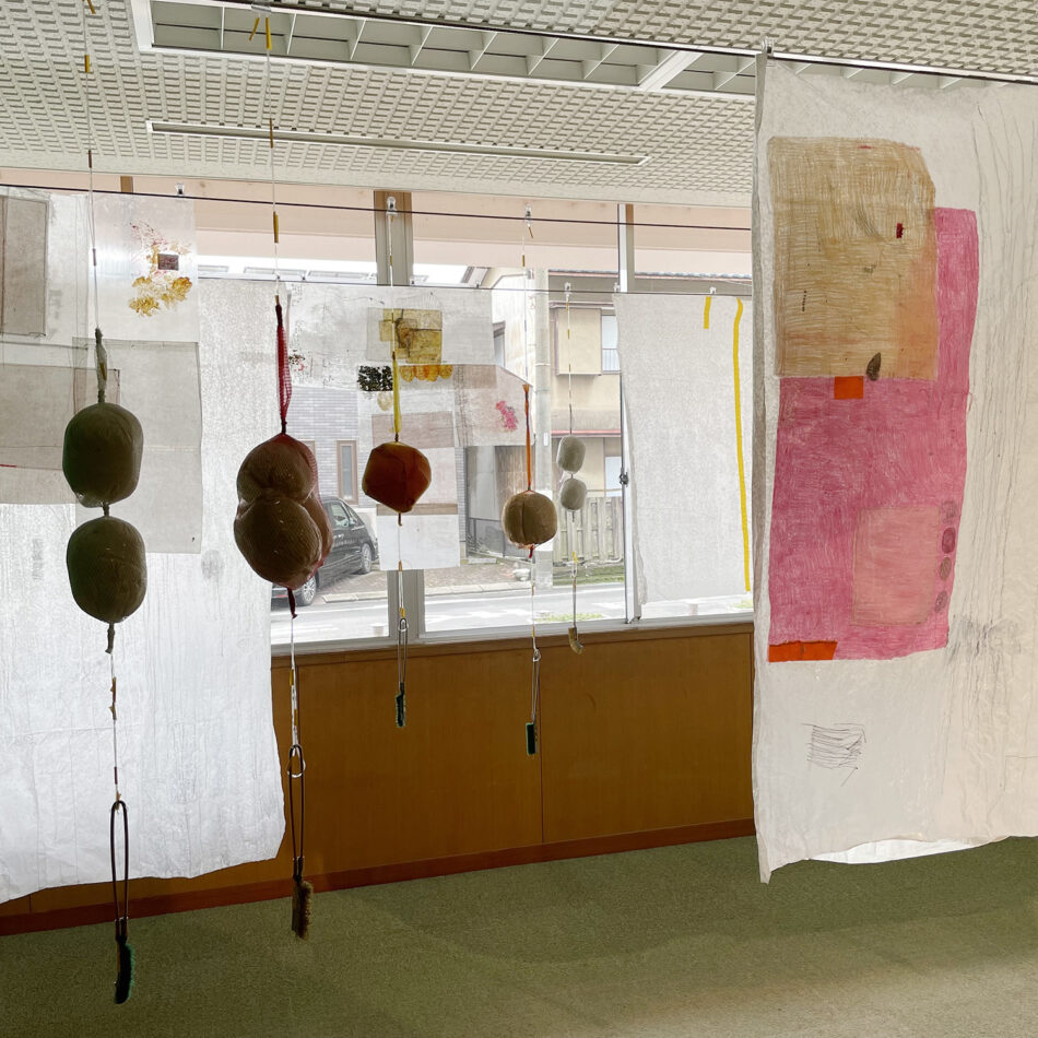 南アフリカのニャカロ・マレケ の《一日中頭の中にある場所》(2022)は、平行に並ぶかつて応接室、会議室、校長室だった3室を繋ぐように張られたワイヤーに、主に紙や布などで作られたドローイングやオブジェクトが吊り下げられている。無機質な空間の中、窓から注ぐ光によって姿を変え、窓の外の風景との対比や、鑑賞者が近づくときの空気の動きで微妙に作品の見え方が変わるのが面白かった。