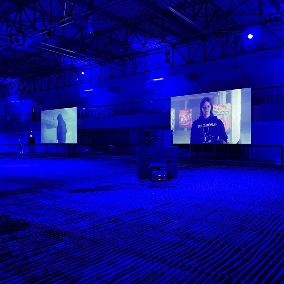 旧一宮市立中央看護専門学校のすぐ裏手に回るとすぐに旧一宮市スケート場を利用した展示会場。真っ青なライティングの中に響く大音量の低音、スケート場としての役割を終え氷を作るための冷却管が剥き出しになったリンクが広がり、そこには巨大なモニタが掲げられている。ドイツの作家アンネ・イムホフ の作品《道化師》(2022)。モニタには過去のパフォーマンスの映像が流されている。全部は見られなかったが、ストリート的な感覚も匂うパフォーマンスに新しさを感じる。