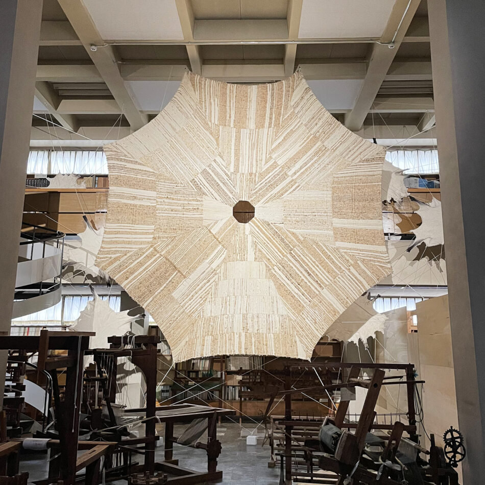 一宮駅東側の作品はこれで一通り見終えたので、今度は駅の反対側の展示会場へと向かう。20分ほど歩いて豊島記念資料館へ。こちらは元は地元の図書館で、現在は織機・撚糸機などが収蔵・展示されている。こちらでは遠藤薫 の作品《羊と眠る》(2021-2022)。会場1階には展示されている機械と共に、糸の原料ともなる羊にまつわる映像やオブジェ、戦時中に織物工場で働いた女工へのインタビュー映像などを展示したインスタレーションが広がる。それらを見て、羊や糸・織物と人との関わりに頭を巡らしながら2階に上がると、羊毛の落下傘とそれを囲むように広げられた小型の羊皮紙で作られた落下傘が目に飛び込む。落下傘の形は、作者曰く軍需品でありつつ人命を救うという両義的な意味から採られたそう。この部屋には放置された木製の機械、壁には図書館時代の本棚も残っており、それらとの対比もあって、今回の展示の中でも心に残る作品の一つだった。