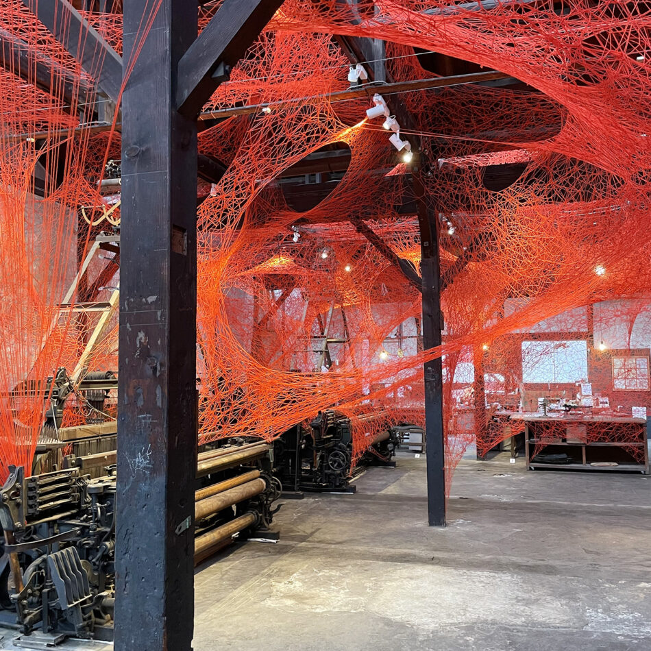 次に向かったのは「のこぎり二」。こちらにはバスに乗り、10分程度で到着。のこぎり形の屋根が印象的なかつて工場だった場所に、現在はカフェやギャラリーが入っている。ここでは古い織機と建物を蜘蛛の巣のように赤い糸で結びつけた塩田千春の《糸をたどって》(2022)を見ることができた。複雑に絡んだ赤い糸の中には、かつて使われていた糸の巻芯が散りばめられている。塩田千春の作品は今まで何度か見たものの、その大きさがあまり好きになれずそれほど興味がなかったが、場所との組み合わせもあってか、この作品には心惹かれた。