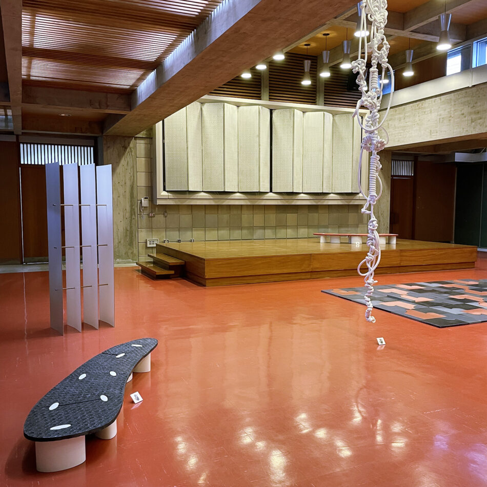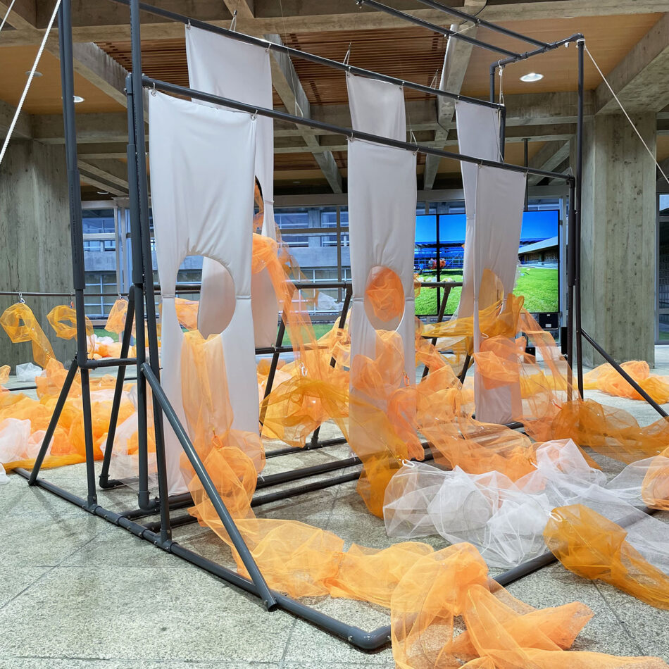 体育館を出た並びのコンクリート壁が目立つスペースには、迎英里子 の作品《approach 13.0》(2022)。オレンジと白のオブジェが色鮮やかだが、作品自体はオブジェそのものよりそれを使ったパフォーマンスが主眼にあるらしく、以前展示場所の向かいにある中庭で行われたパフォーマンスの様子が大型のモニタに映し出されていた。この作品は織物が制作される工程を抽象化したものということだったが、パフォーマンスの様子も、その結果生まれたオブジェもとても面白いと感じた。できれば生のパフォーマンスを見られる日に訪れたかった。迎さんの作品、今後も気にしていこう。