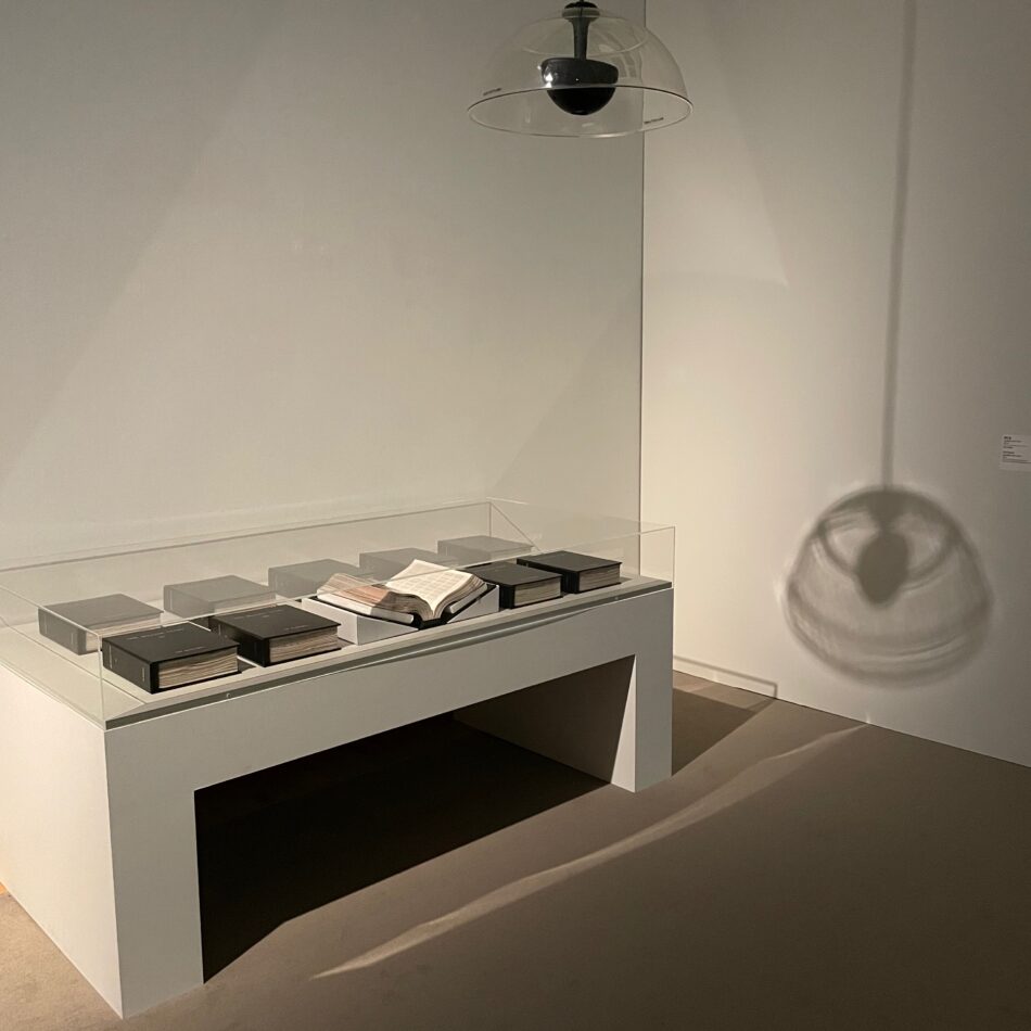 河原温《One Million Years》。紀元前998031年から西暦1969年までを「過去」、西暦1981年から1001999年をまでを「未来」とし、その西暦年を印刷した書籍状の作品。上のカップ状の部分か男女の声で過去と未来の西暦年を読み上げるパフォーマンスの音声が流れる